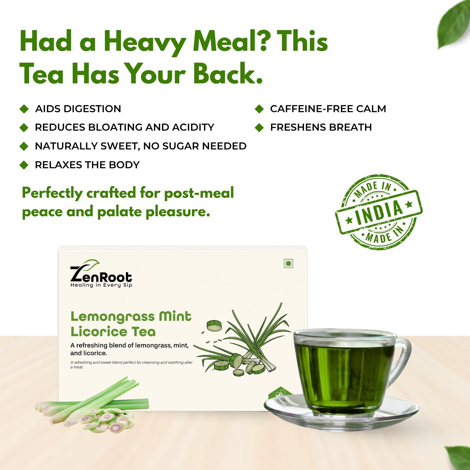 Lemongrass Mint Licorice Tea with Lemongrass, Mint & Licorice soothes indigestion and refreshes your system. It calms the stomach, relieves discomfort, and adds a cooling effect. A reliable herbal choice for everyday digestive health.